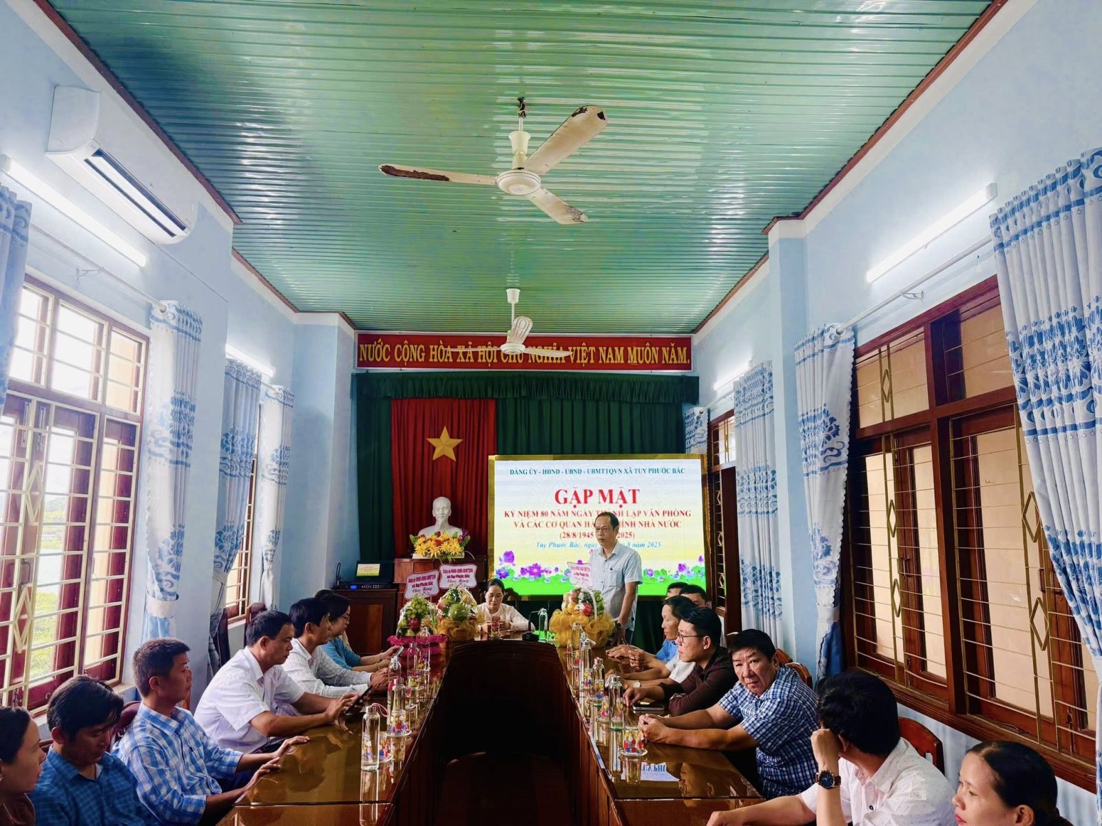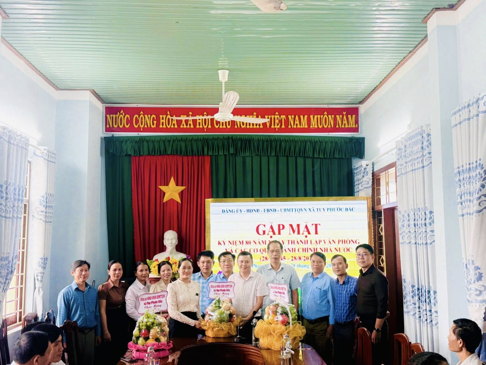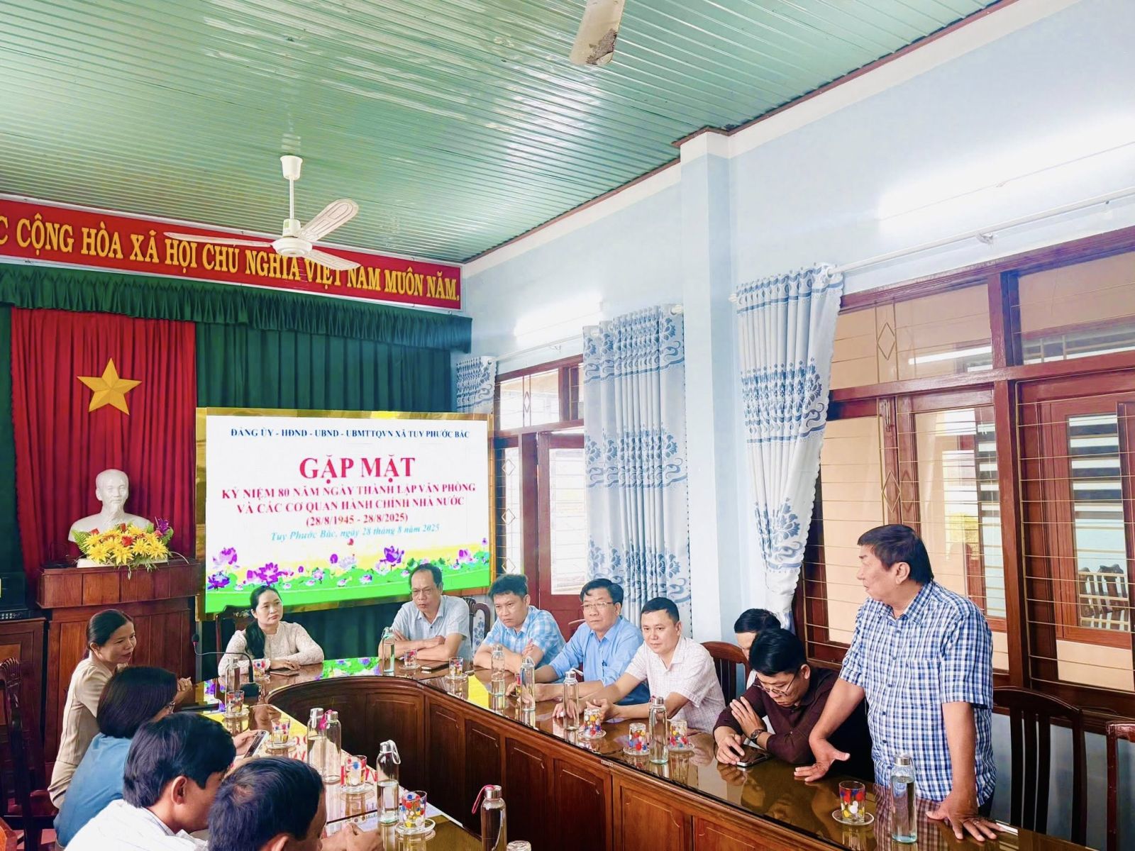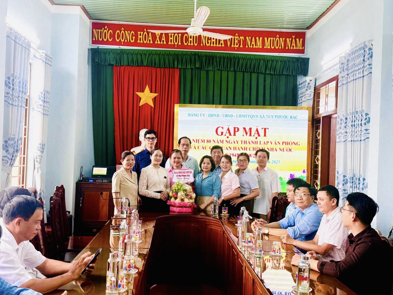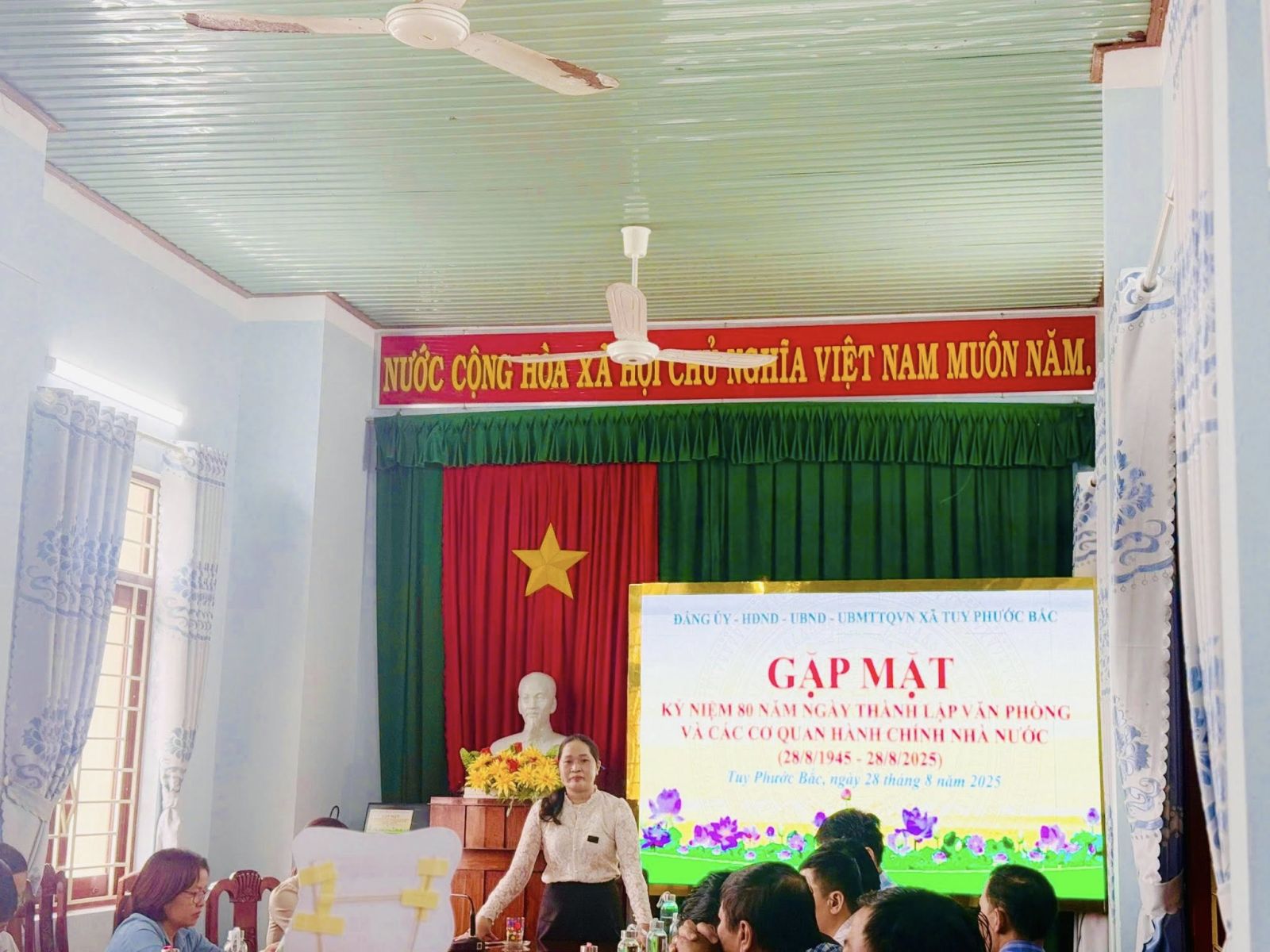 Chiều ngày 28/8/2025, Đảng uỷ - HĐND - UBND - UBMTTQVN xã Tuy Phước Bắc đã tổ chức buổi Gặp mặt kỷ niệm 80 năm Ngày thành lập Văn phòng các cơ quan hành chính Nhà nước (28/8/1945 - 28/8/2025). Dự buổi gặp mặt có đồng chí Huỳnh Thị Thanh Nguyệt - Bí thư Đảng uỷ, Chủ tịch HĐND xã; các đồng chí lãnh đạo Đảng ủy, HĐND, UBND xã, cùng toàn thể lãnh đạo và cán bộ công chức, viên chức đang làm việc tại UBND xã.