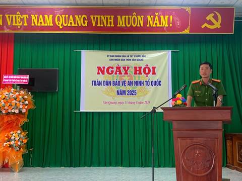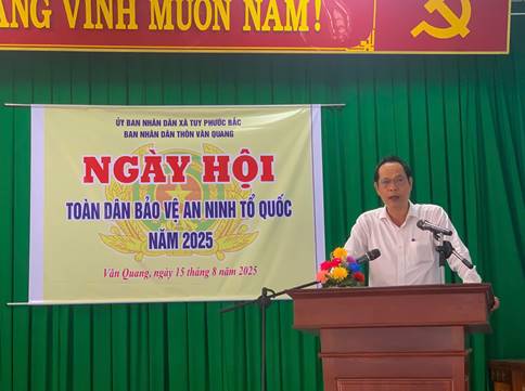 Phát biểu chỉ đạo tại Ngày hội, đồng chí Nguyễn Hùng Tân - Chủ tịch UBND xã ghi nhận, đánh giá cao những kết quả, thành tích đã đạt được trong phong trào toàn dân bảo vệ an ninh Tổ quốc trên địa bàn xã Tuy Phước Bắc nói chung và địa bàn thôn Văn Quang nói riêng. Thời gian tới, đề nghị Công an xã, Ban Nhân dân thôn Văn Quang và bà con Nhân dân tiếp tục nhận thức sâu sắc về vị trí, vai trò, tầm quan trọng của phong trào Toàn dân bảo vệ an ninh Tổ quốc, xác định đây là nhiệm vụ trọng tâm, thường xuyên, phát huy sức mạnh của cả hệ thống chính trị và toàn dân tham gia phong trào. Đổi mới về nội dung, hình thức, biện pháp công tác xây dựng, duy trì và nhân rộng các mô hình quần chúng tự quản, tự phòng, tự hòa giải hoạt động hiệu quả gắn với gắn với các phong trào thi đua yêu nước. Chú trọng xây dựng và củng cố các lực lượng nòng cốt ở cơ sở thực hiện nhiệm vụ bảo vệ ANTT.