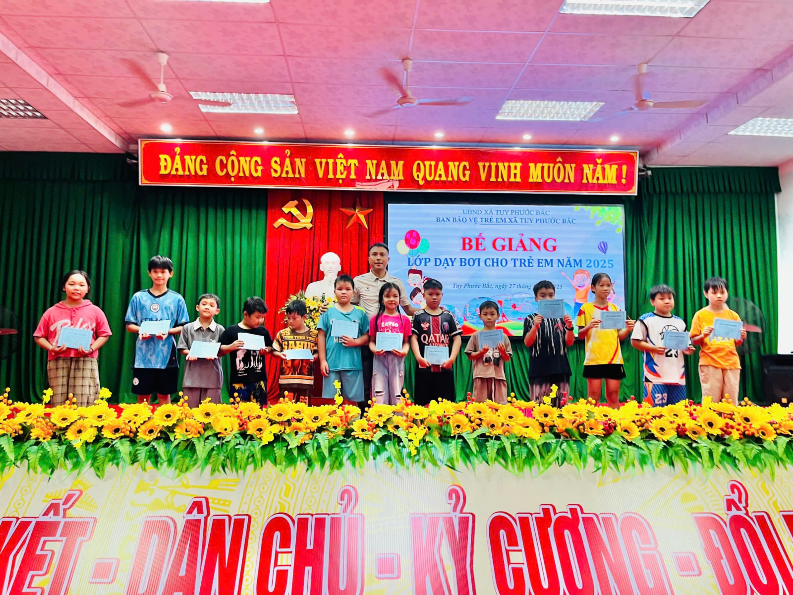 Chiều ngày 27/8/2025 tại Trung tâm Văn hóa - Thể thao xã Tuy Phước Bắc, UBND xã phối hợp với Đoàn xã tổ chức bế giảng lớp dạy bơi cho trẻ em.