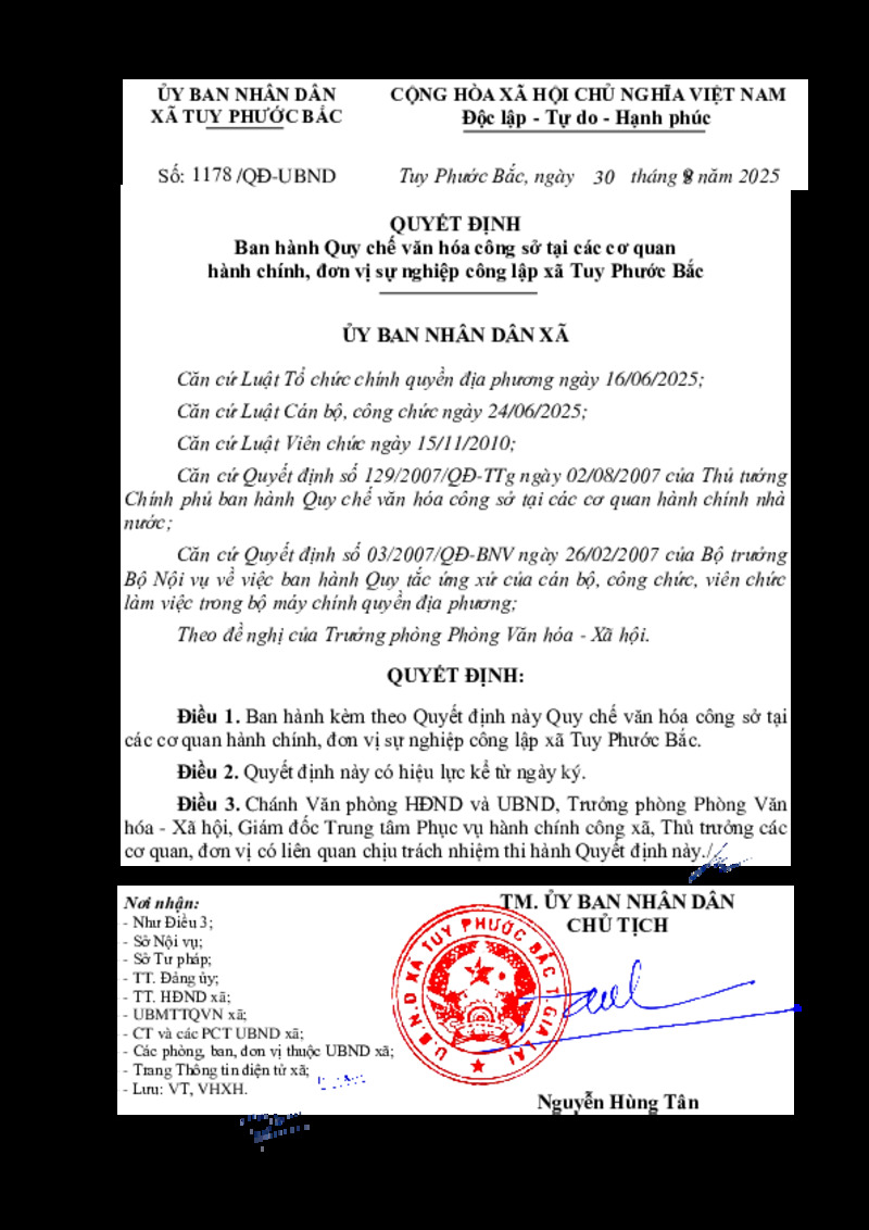 Tiêu đề văn bản | Ban hành Quy chế văn hóa công sở tại các cơ quan hành chính, đơn vị sự nghiệp công lập xã Tuy Phước Bắc | ||